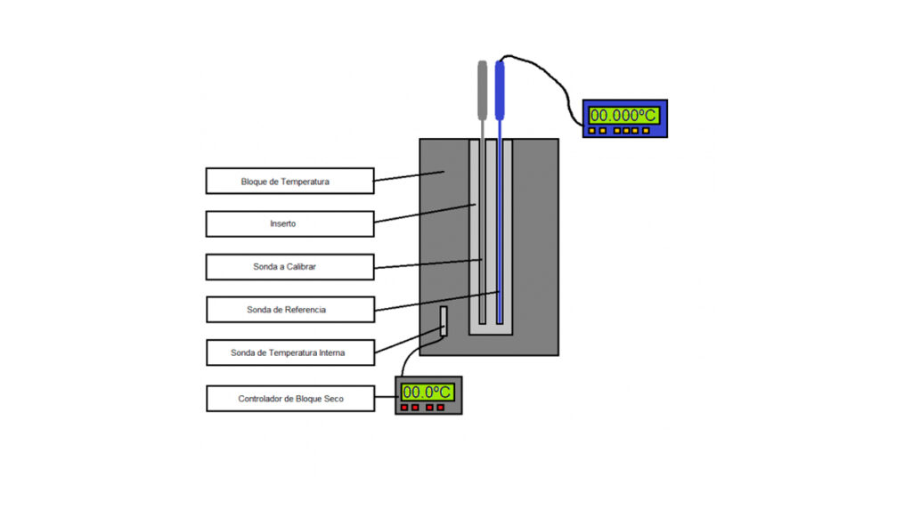 El bloque seco contiene una fuente controlada que extrae/agrega energía térmica a un bloque de metal que posee un orificio en el cual se deposita un cilindro denominado inserto.