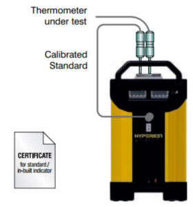 - El sensor del equipo a medir y del patrón se introducen en el líquido y el mismo transmite la temperatura por convección a los sensores.