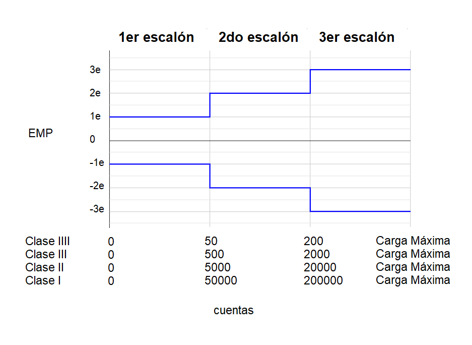 Las tolerancias en uso dentro de metrología se componen por tras rangos (escalones) definidos según una cantidad de cuentas. Para cada uno de ellos le corresponde un múltiplo del valor de “e” según se describe en la siguiente figura.